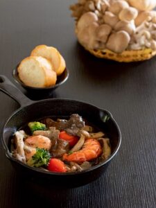 群馬の豊かな自然が育んだ香り高いきのこをふんだんに使用し、ぷりぷりの海老とともに、熱々のオリーブオイルでじっくりと煮込んだ贅沢なアヒージョです。